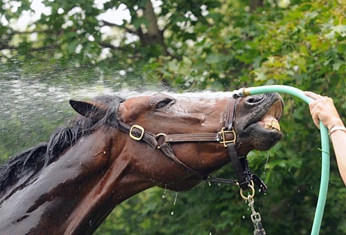 A simple calculation of Ambient Temperature (° F) + Relative Humidity (%) – Wind Speed (mph) will indicate heat stress risk level. For example, ambient temperature of 98°F with a 55% relative humidity and wind at 5 mph; 98 + 55 – 5 = 148. If the calculation equals 130 or less, then the horse’s own cooling mechanisms will work effectively. Between 140 and 170, the horse has partial cooling capacity and may need some assistance cooling down. When the result is greater than 180, the horse has a significantly impaired ability to cool and is at high risk for heat stress or even heat stroke.
