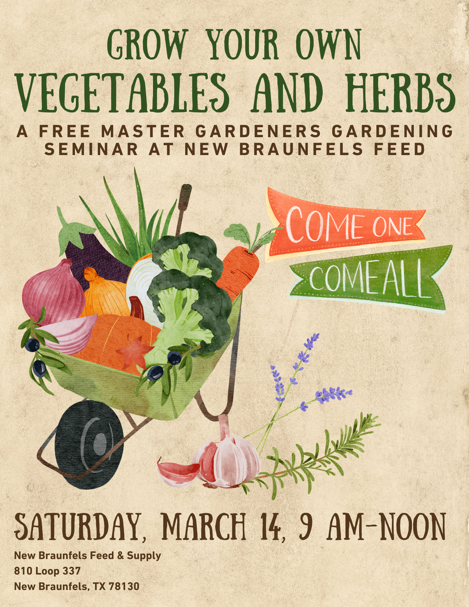 - Where: New Braunfels Feed & Supply (810 Loop 337, New Braunfels, TX 78130)