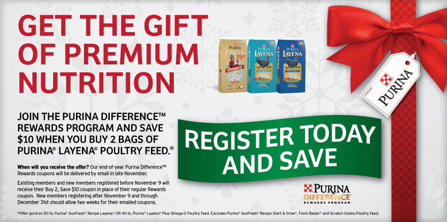 Join the Purina Difference Rewards Program and save $10 when you buy 2 bags of Purina Layena Poultry Feed!
