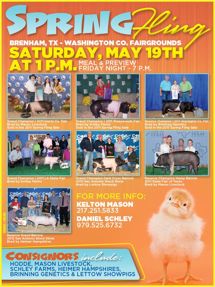 Mark your calendars for the 2012 Spring Fling Showpig Sale at the Washington Co. Fairgrounds in Brenham, TX. It begins May 18th with a meal and preview at 7pm. Sale starts May 19th at 1 pm.