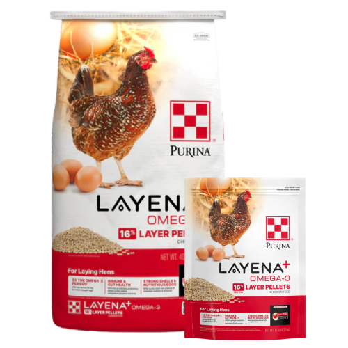 Purina Layena+ Omega-3 pellets are a complete feed for laying hens 18 weeks and older to support optimal hen health and consistent egg production with added omega-3 fatty acids. Purina Layena+ Omega-3 includes the Oyster Strong System for strong shells.